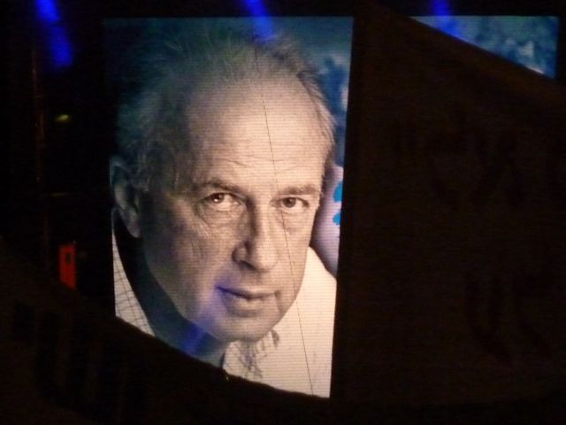 First the voice of Arik Einstein, who hasn’t appeared on a stage in years, singing the song/phrase that President Bill Clinton created in his farewell back in 1995,“Shalom Chaver”, with images of Rabin’s life on the screen, as has been at all of the past 15 rallies. I never realized before that my neighbor on Hess Street in Tel Aviv, Shem-Tov Levy, was the composer of the music.