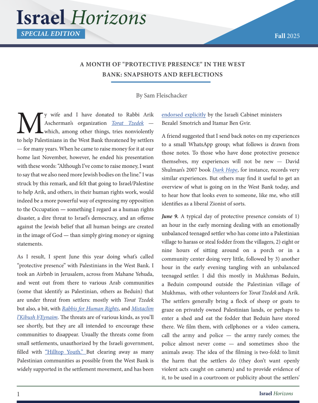 Israel Horizons is not a newsletter. Rather, it publishes almost only original pieces about issues and events, analyses of current developments, and book reviews, as well as publicizing upcoming events by Partners for Progressive Israel and of interest to our supporters. We generally have one or two articles by Israelis affiliated with Meretz.