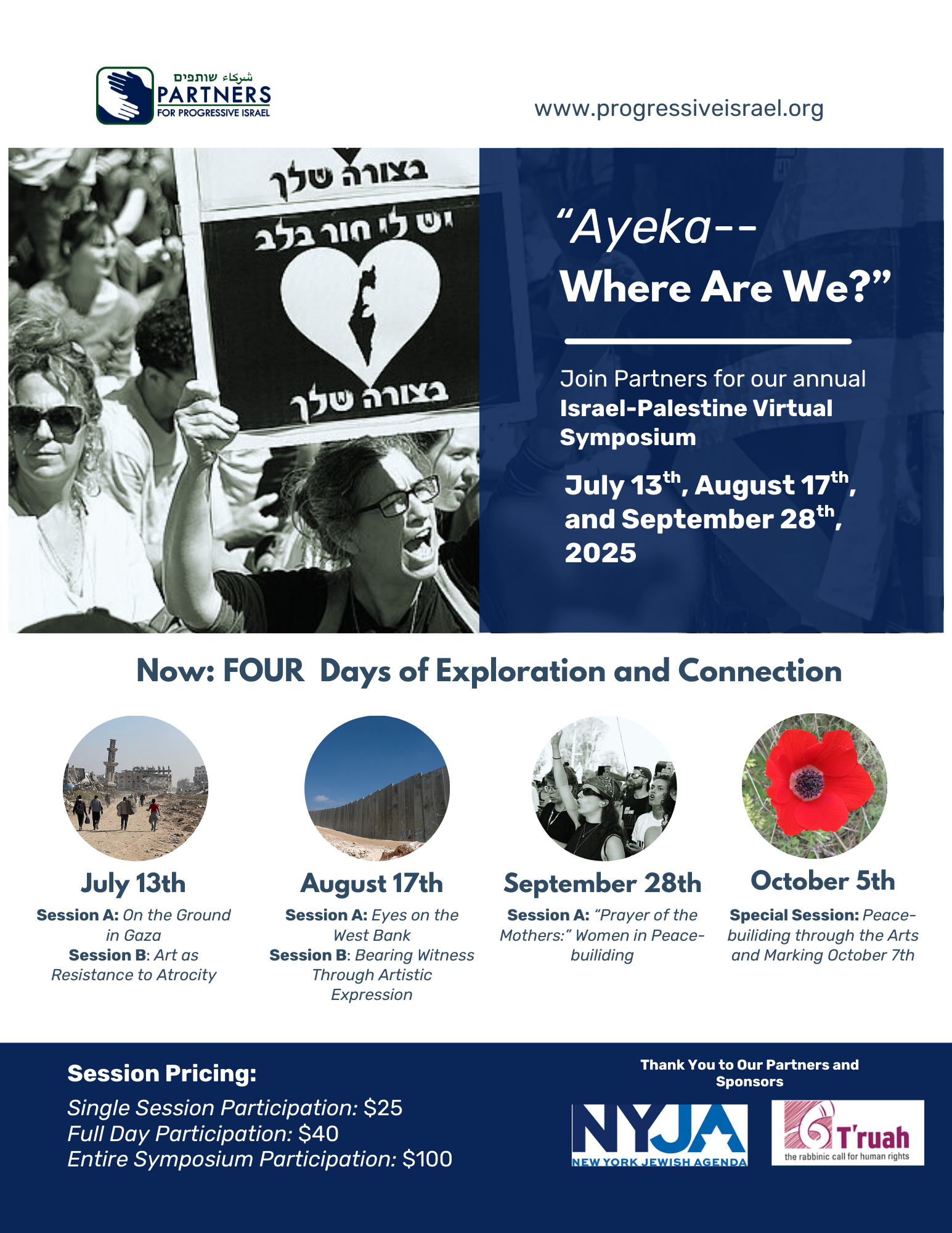 For its sixth annual virtual Symposium, Partners offers participants the opportunity to explore, bear witness and connect to Israelis and Palestinians who have committed themselves to resisting despair through resolute action. They have responded to “Ayeka?” by resolving to help alleviate the suffering that pervades the region.